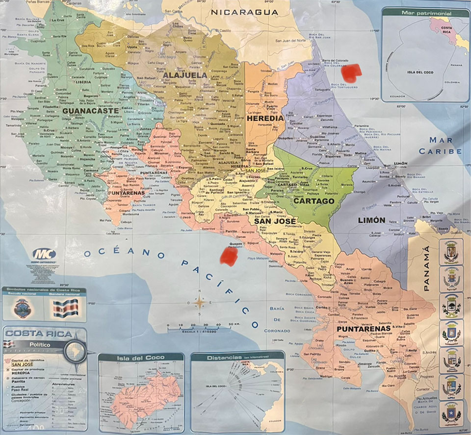 On the map you can see the Pacific Ocean side of Quepos and Manuel Antonio and the Caribbean Sea side of Tortuguero. Two coastlines with two distinct rhythms. One small country holding immense diversity.